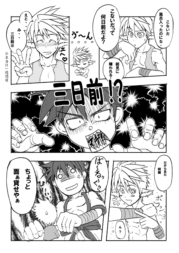 漫画としては、まだ質が低いなぁと自分でも思います(汗) でも、全くかけなかったのを考えたら、コレ自分で描いたんやなぁと、ふと感慨にふけってみたり(苦笑) さて、お風呂大好きで、綺麗好きの総見君 汚れまくりなバルクが許せない様です!! さぁ、次こそは、出るか、全裸!!?